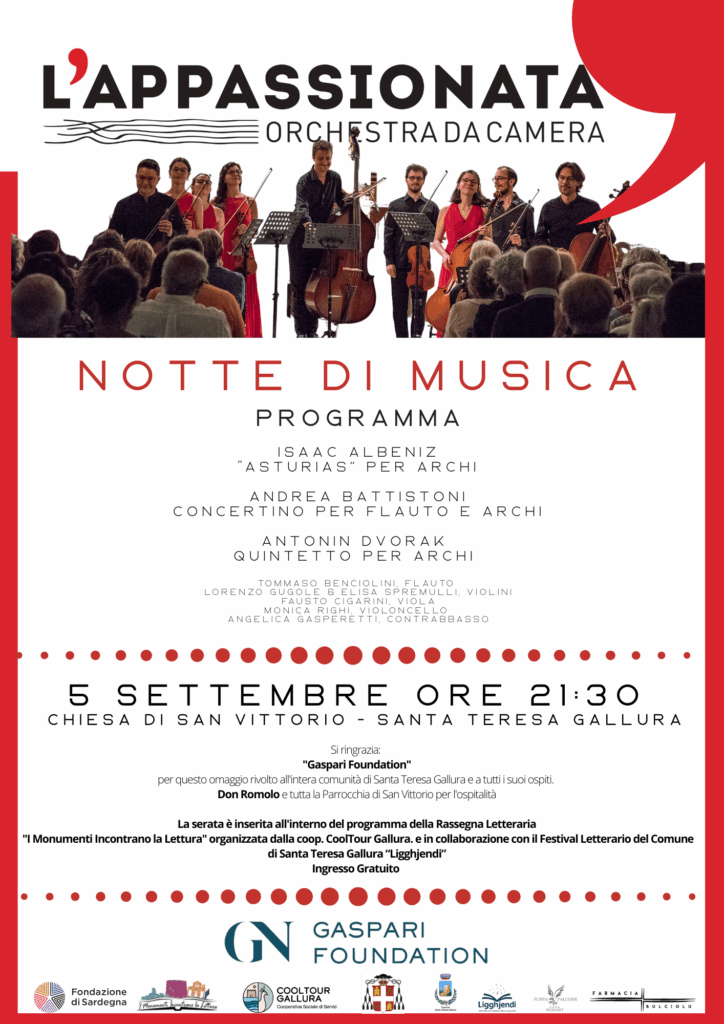Come sempre il concerto si svolgerà nella Chiesa di San Vittorio ed è un omaggio all’intera Comunità di Santa Teresa Gallura da parte dell’importantissima “Gaspari Foundation”, in collaborazione con il Festival Letterario del Comune di Santa Teresa Gallura “Ligghjendi”. L’ingresso è gratuito.